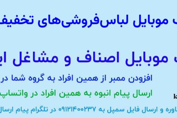 جهت دریافت رایگان بخشی از بانک موبایل مورد نظرتان، لطفاً در تلگرام به شماره ۰۹۱۲۱۴۰۰۲۳۷ پیام ارسال کرده و کسب‌وکار خود را معرفی کنید تا بانک موبایل به صورت فایل اکسل برای شما ارسال شود.